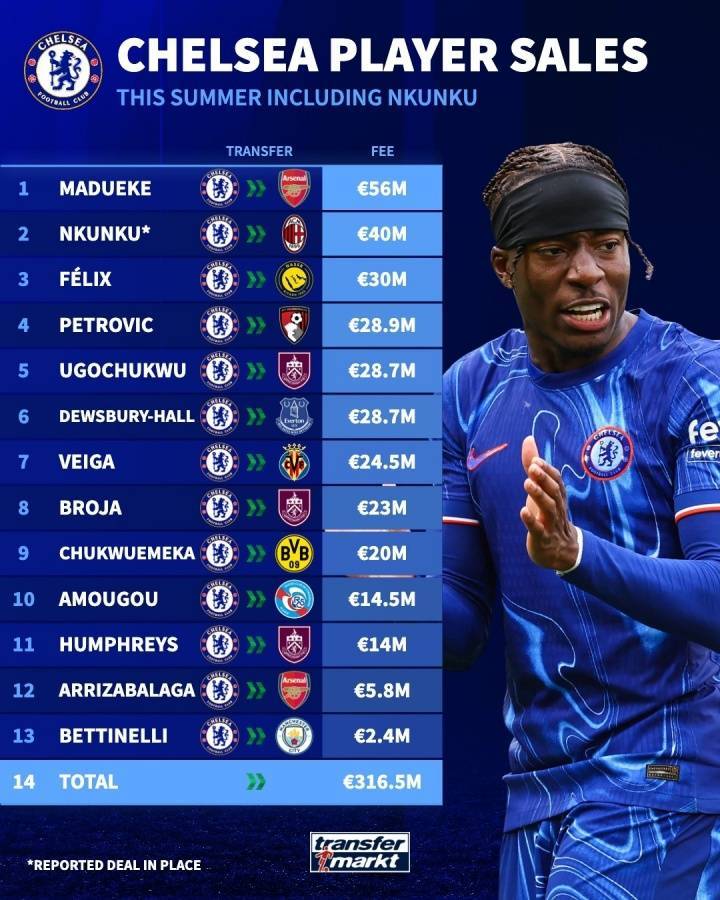 据德转统计,切尔西今夏卖人总收入将达到3.165亿欧元,冠绝全球,比卖人榜第二位的伯恩茅斯多了近8000万欧元。